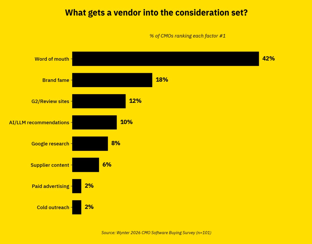 42% of CMOs rank word of mouth #1. 2% rank paid ads #1. That's a 20x gap between what drives consideration and where most budgets go. We asked 101 B2B SaaS CMOs to rank what actually gets a vendor…