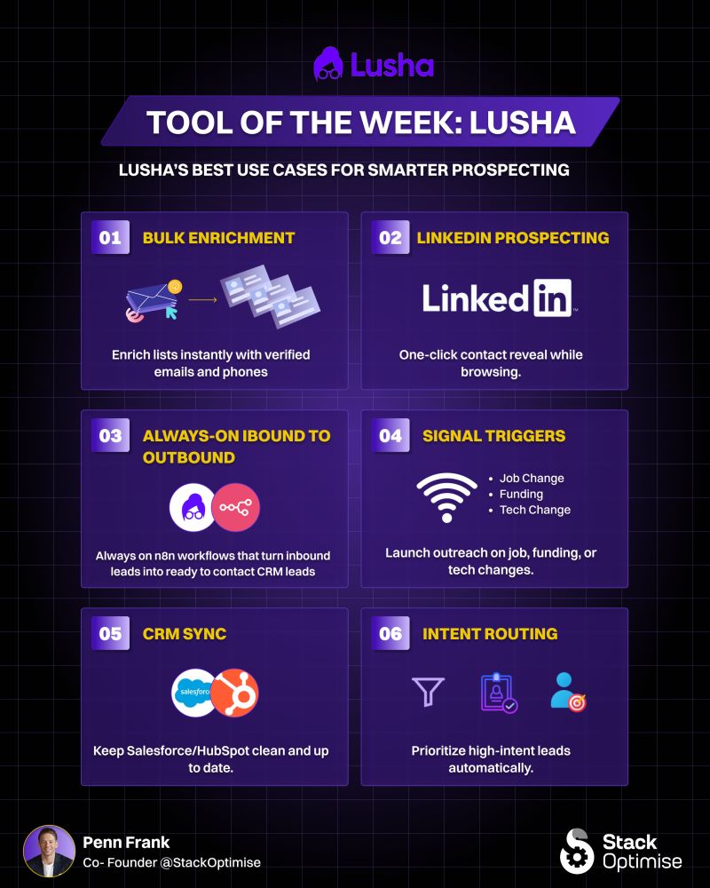 Tool of the Week: Lusha ⚙️ When I was 20, just out of uni, I somehow ended up as Head of Sales at a super young startup. I had no playbook. I just knew I needed one thing: good phone numbers, fast.…