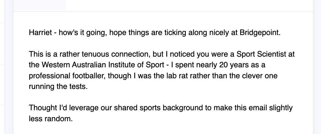 Unpopular belief on outreach copy: Make your personalisations irrelevant. Everyone says personalisation must tie directly to the offer. If framed with the right tone, however, this is not necessar…