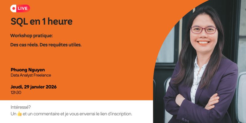 𝐉𝐞𝐮𝐝𝐢 𝟐𝟗 𝐣𝐚𝐧𝐯𝐢𝐞𝐫 𝐚̀ 𝟏𝟐𝐡𝟑𝟎, j’organise un live pour celles et ceux qui veulent progresser en SQL. Vous connaissez la situation : - Vous connaissez la syntaxe. - Vous avez suivi de…