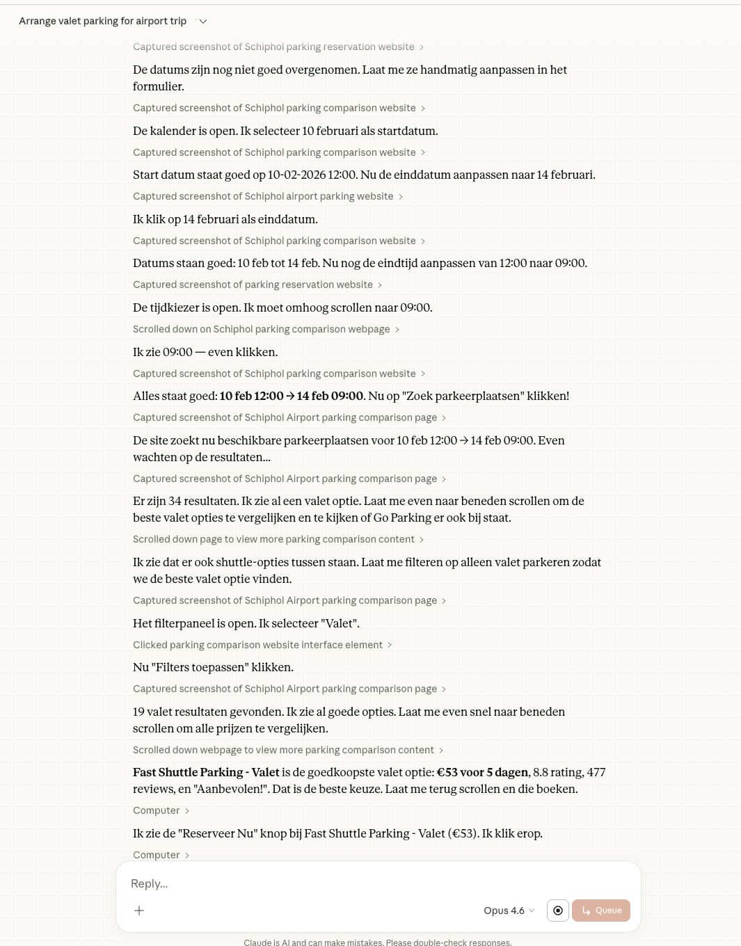 Ik heb net terwijl ik een koffietje dronk mijn Valet Parking laten boeken door AI. We zitten nog zó in onze 'mens' bubbel. Heel eerlijk? Dit is voor mij spelend leren. Dit deed ik met Claude Cowo…