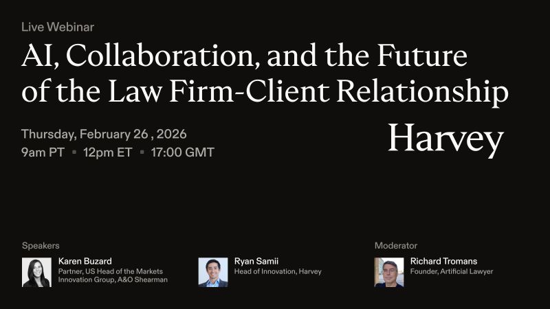 Harvey Webinar: ‘AI, Collaboration + The Law Firm-Client Relationship’ This is going to be a good one - and covers a really important topic: how AI and collaboration will change the law firm-client re…