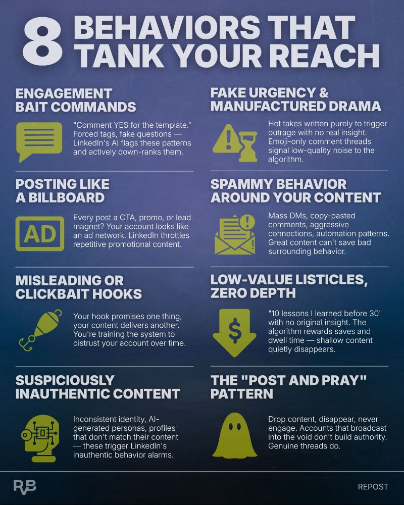Why did my post die after 6 minutes? Maybe it wasn't the content. Maybe LinkedIn quietly buried it. I've seen accounts with great content get crushed by their own behavior. After analyzing what actua…