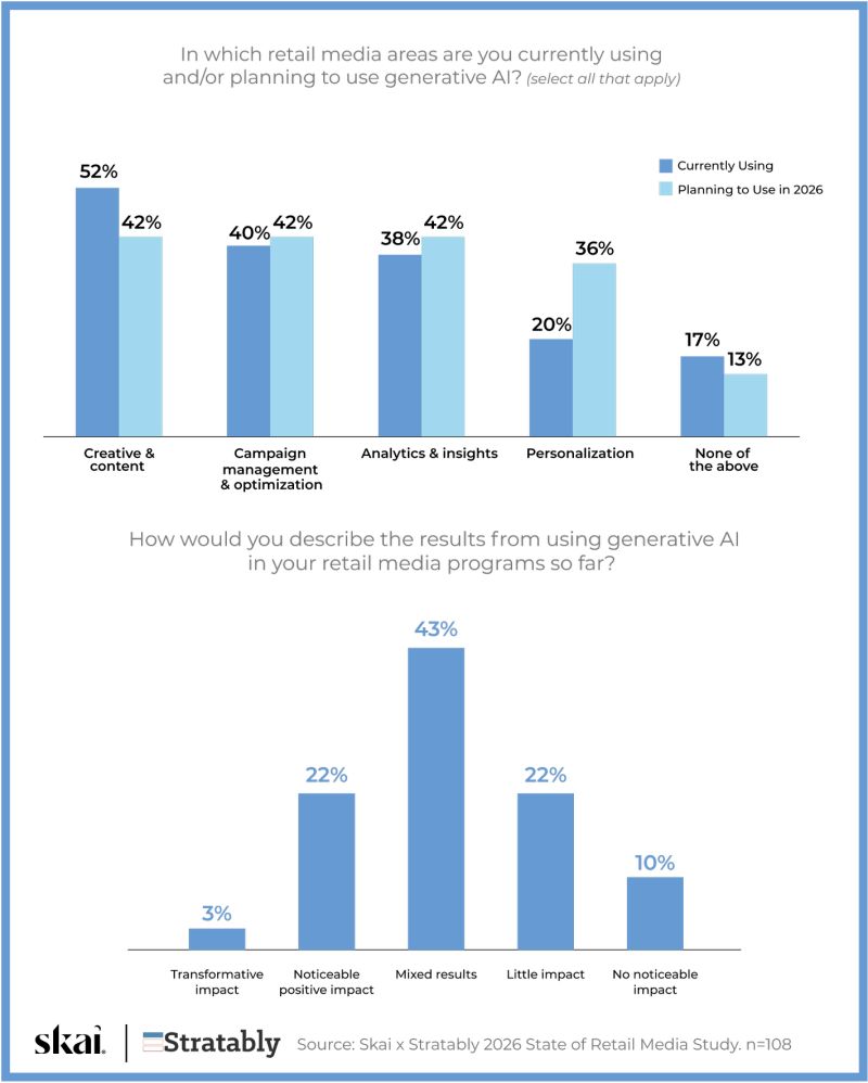 The State of Retail Media & GenAI. Adoption hits 63% ...but only 25% are seeing real impact. The fifth annual State of Retail Media report from Skai and Stratably just dropped, and the GenAI finding…
