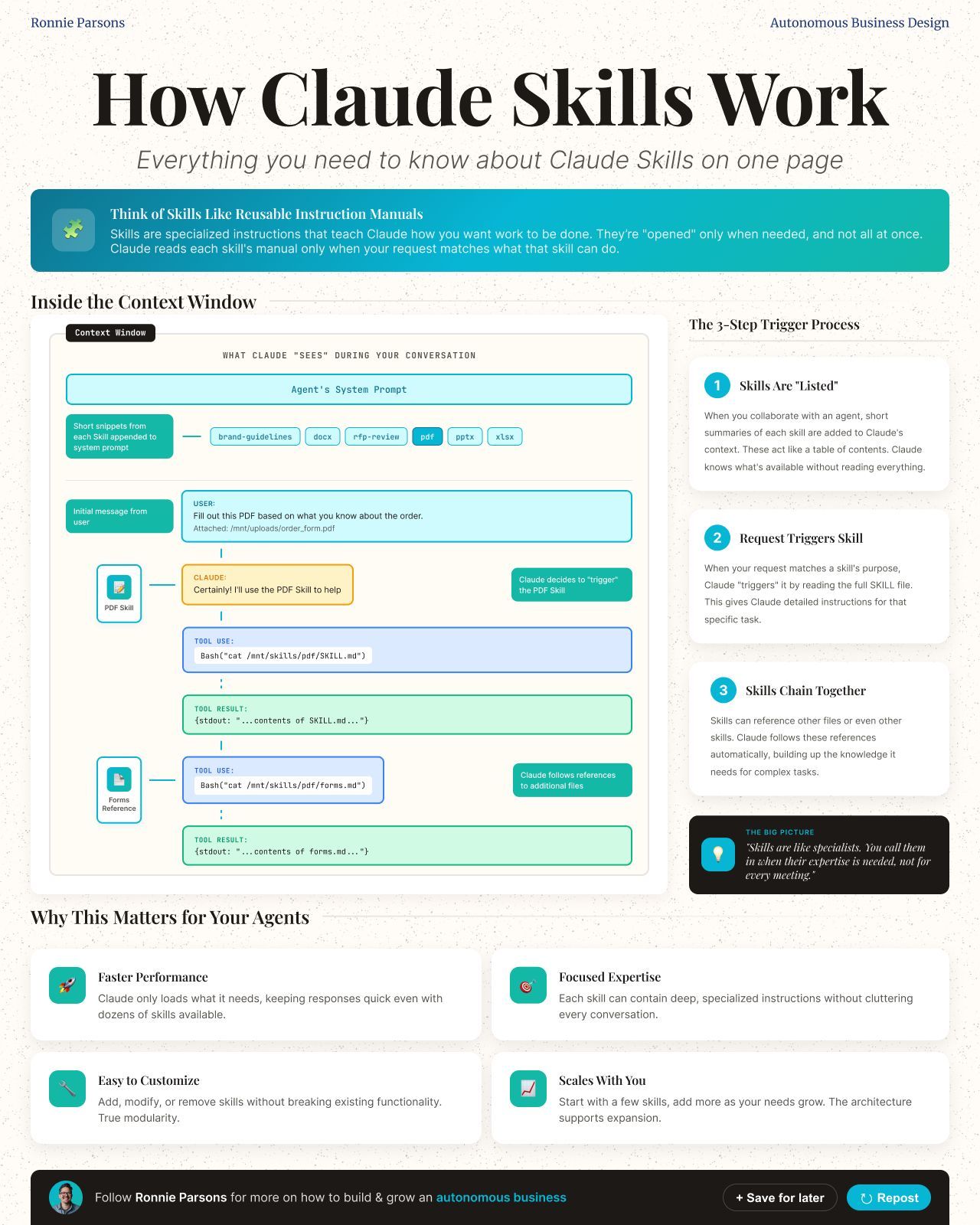 Ronnie Parsons positions himself as a high-level architect of the autonomous business, specifically helping solo founders scale their impact through advanced AI systems. His content strategy centers on the technical and structural "how-to" of Claude’s ecosystem, moving beyond basic prompting to advocate for domain-driven architecture and reusable AI skills. He is notable for treating AI not as a chatbot, but as a modular engineering department, offering deep-dive playbooks on folder structures and context layering that most creators overlook. By intersecting systems thinking with rapid AI deployment, Parsons transforms the narrative of the one-person business from a manual grind into a sophisticated, self-correcting operating system.