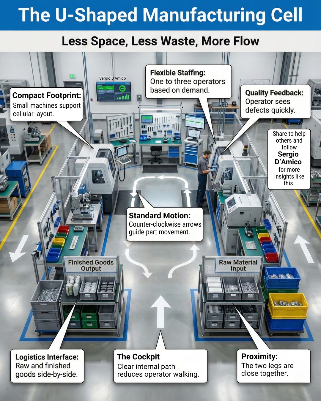 Parts shouldn’t travel miles. U-shaped flow keeps everything close. Flow wins work. But most teams fight flow each day. Here’s how a U-shaped manufacturing cell helps you win: 1/. Use one clear pa…