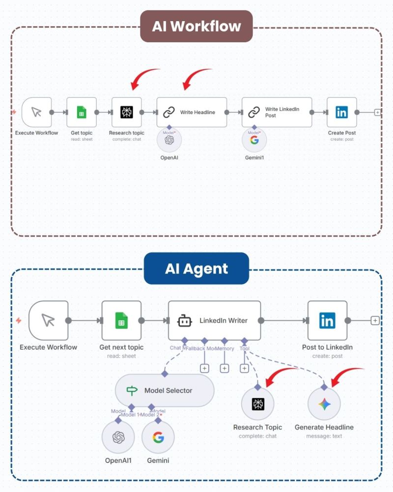 AI Workflow vs AI Agent Most people think AI Agents are the future. They're flexible and autonomous. But are they really the right choice for your task? 🧩 𝗔𝗜 𝗪𝗢𝗥𝗞𝗙𝗟𝗢𝗪 Each step is predef…