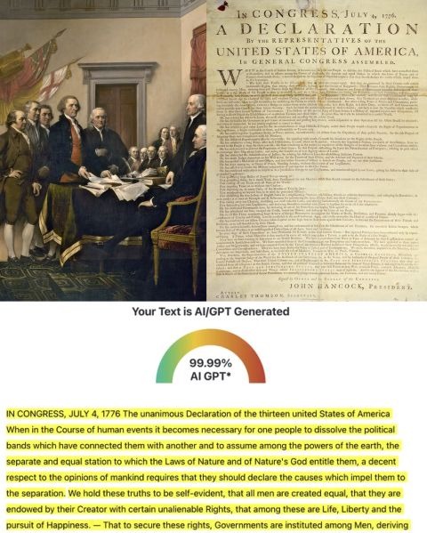 AI detector flagged the 1776 Declaration of Independence as 99.99% AI-written 😅 Either Thomas Jefferson was a time-travelling prompt engineer... Or these tools are completely broken. Let’s break it…