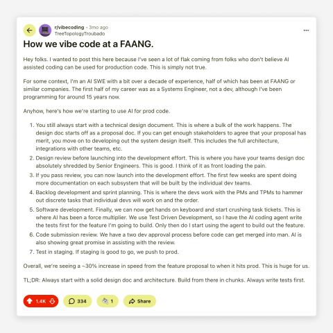 A guy from Reddit explained how Software Engineers vibe code at FAANG 👇 People still argue that AI can’t be used for production code. That’s just not true. A seasoned AI SWE (with a 10+ years in th…