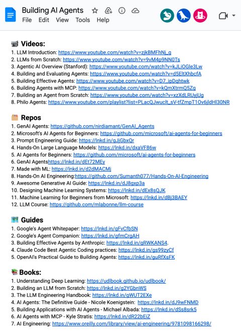 The ultimate AI Agents roadmap with 50+ hand-picked resources 👇 🎥 Videos 1. LLM Introduction: https://lnkd.in/gTSkue54 2. LLMs from Scratch: https://lnkd.in/gdwTD6Be 3. Agentic AI Overview (Stanfo…