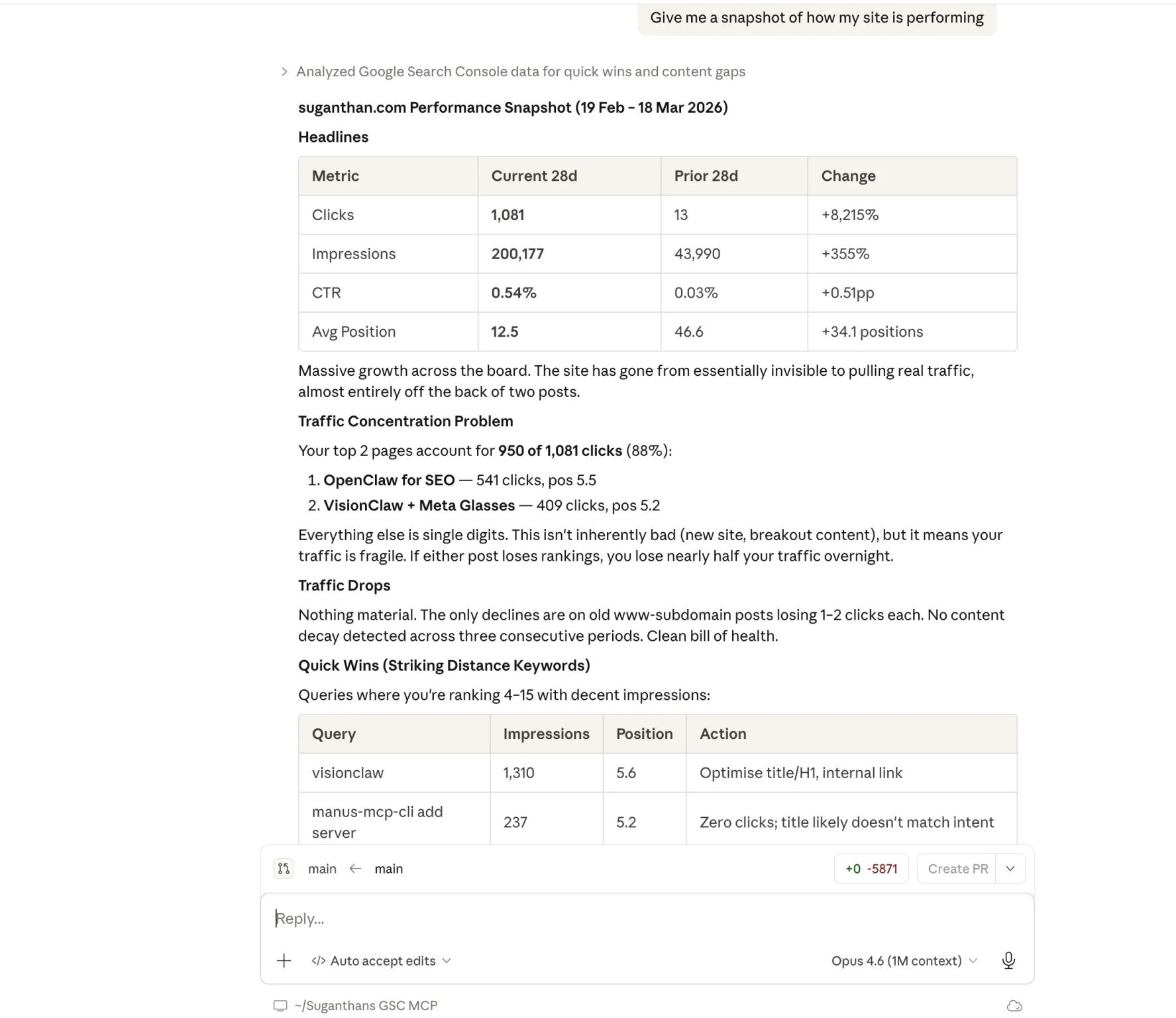 Claude didn't just plot a line. It identified a specific cannibalisation issue between the category pages and the new blog subfolder that started exactly 14 weeks ago.