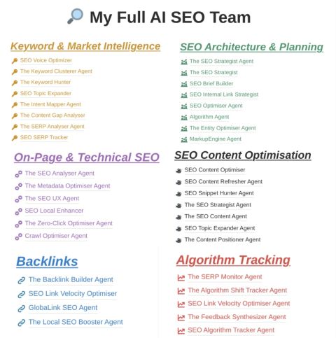 I’ve Built A Full AI SEO Team For You Guys! This team of ai agents isn’t going to magically perfect your seo on it’s own. However, it can definitely help you: -Identify and use more keywords -Aut…