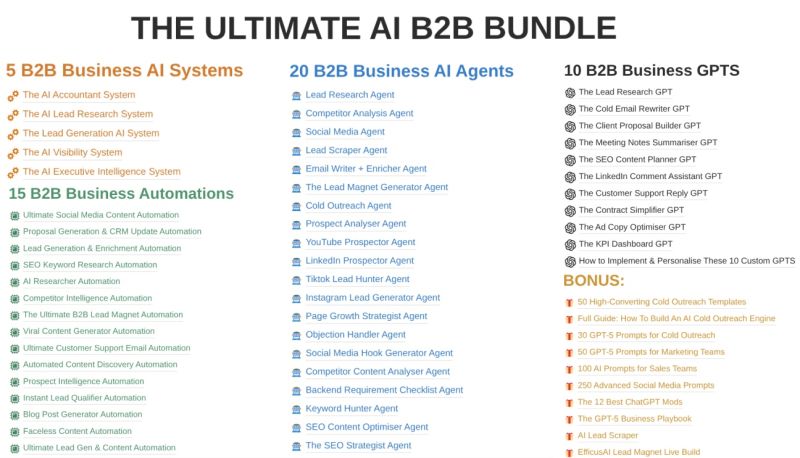 FREE GIVEAWAY 🎉🎁 The Ultimate AI Resource Bundle For B2B I’ve built a collection of ai resources to asisst B2B companies. Inside this bundle: -AI Systems -AI Automations -AI Agents -Custo…