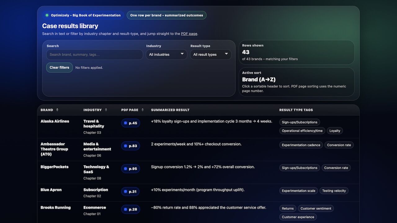 I love a good set of experimentation growth case studies. I received 43 of them in a 111-page PDF. I started scanning, but man - that was a hassle. 40+ MB PDF file in my browser, with different ways c…