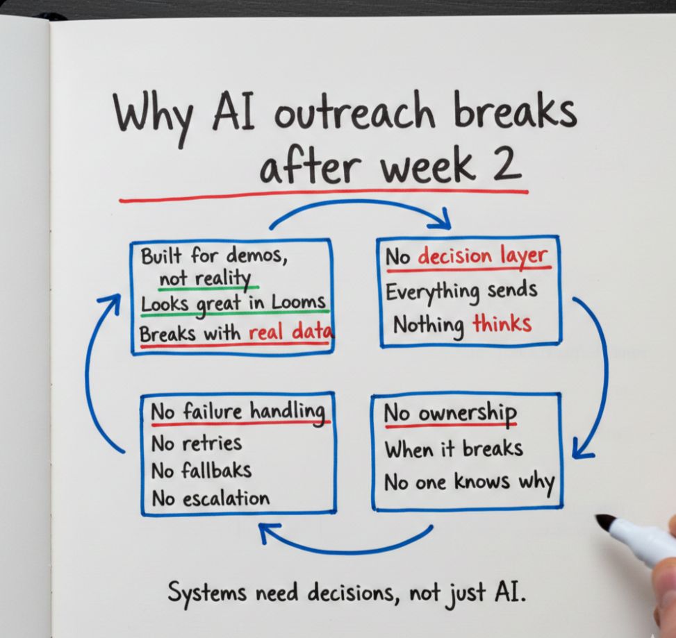 Why most AI outreach systems break after week 2 Most AI outreach doesnât fail on day one. It fails when reality shows up. Messy data. Late replies. Wrong timing. APIs that donât behave. Most setupsâŚ