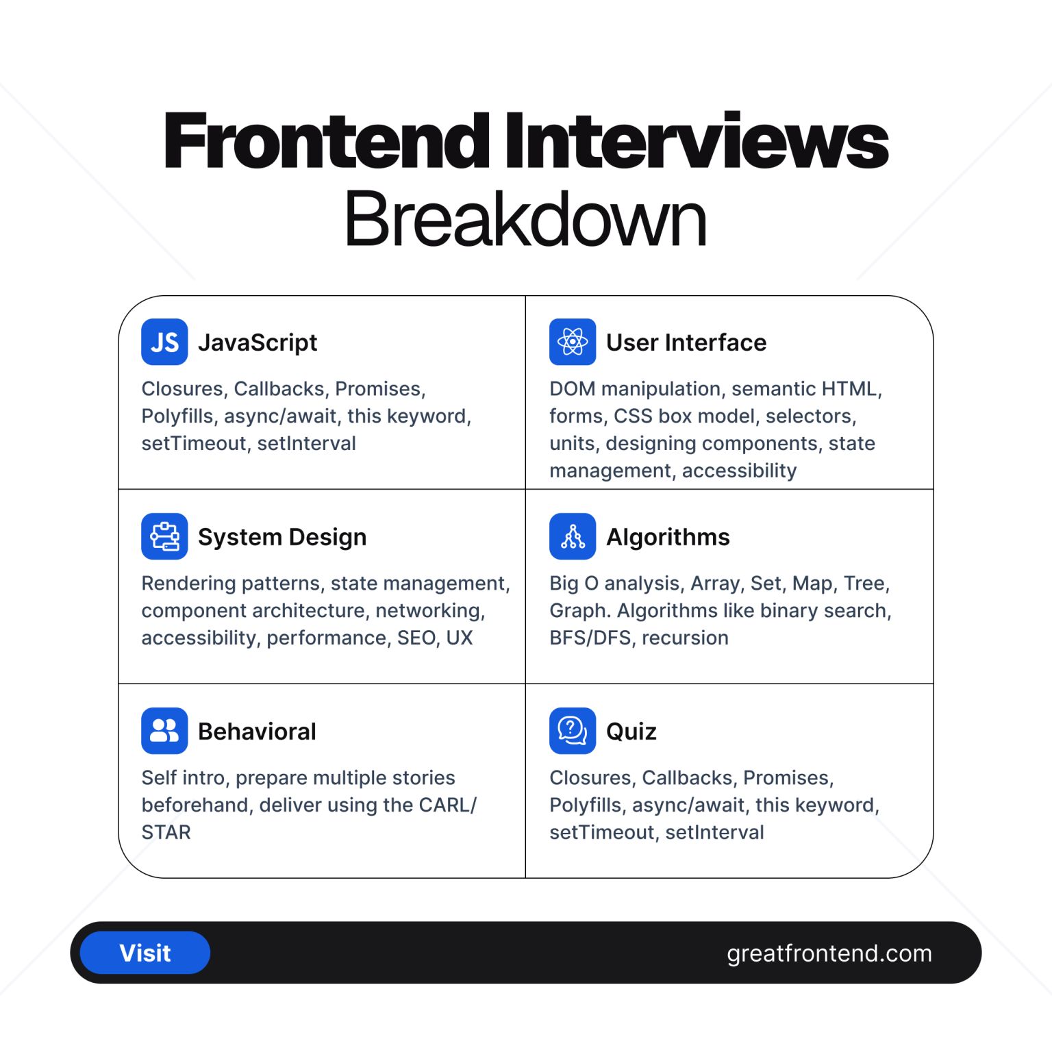 Frontend engineer interviews can be broken down into the following: 👉 1. JavaScript coding interview You need to know: Closures, Callbacks, Promises, Polyfills, async/await, this keyword, setTimeou…