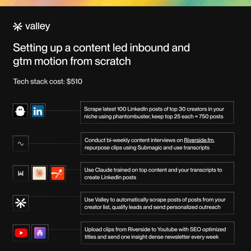 If I were building a content + inbound GTM motion from scratch to take a founder from $300K to $3M+ ARR, here's the exact playbook: 𝗦𝘁𝗲𝗽 𝟭: 𝗖𝗼𝗻𝘁𝗲𝗻𝘁 𝗜𝗻𝘁𝗲𝗹𝗹𝗶𝗴𝗲𝗻𝗰𝗲 → List 30 t…